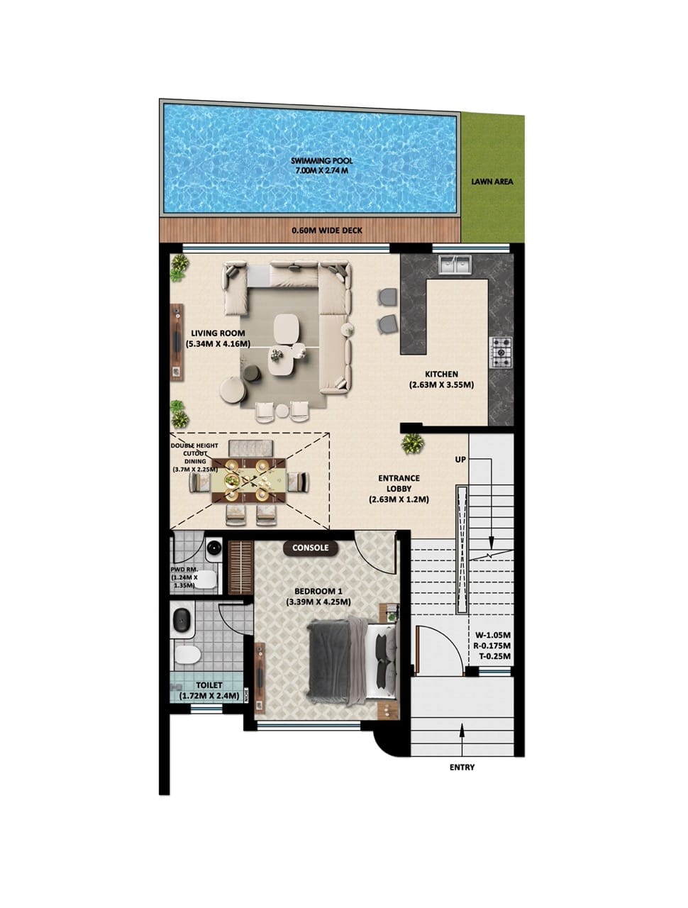 - Ground-Floor Sanctuary: The residence features a private swimming pool and a 23.9 SQM deck directly on the ground level.